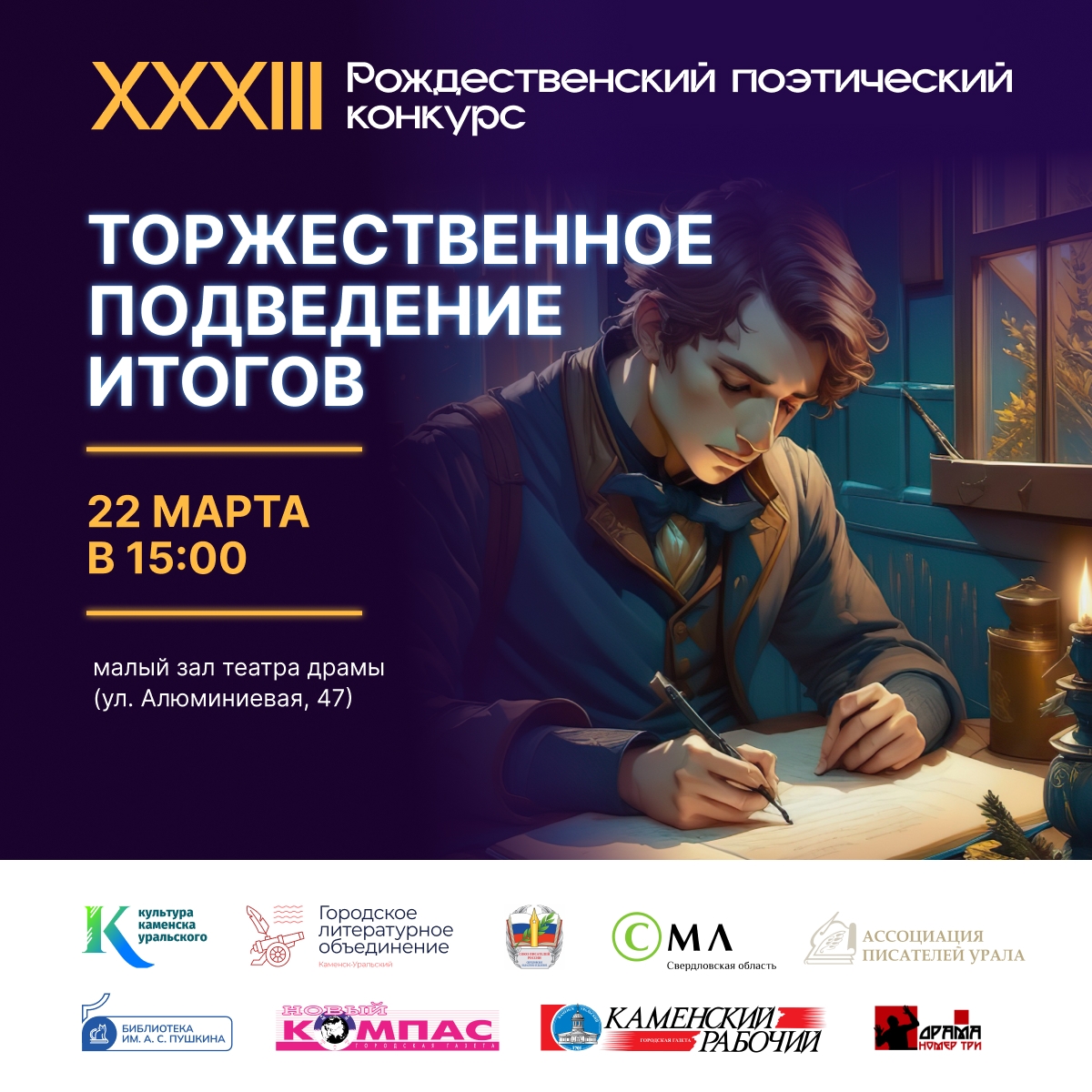 В Каменске-Уральском завершился первый этап ХХХIII открытого областного Рождественского поэтического конкурса. Его участниками стали авторы из Екатеринбурга, Челябинска, Кургана, Тюмени, Ханты-Мансийска, Твери, Самары, Саратова, Нижнего Новгорода, Йошкар-Олы, Ульяновска, Казани, Махачкалы, Краснодара, Омска, Барнаула, Кемерово, Мурманска, Донецка, Санкт-Петербурга, Москвы и других городов. Две заявки поступили из Белоруссии. По решению жюри, во второй тур прошли 58 авторов из 168, подавших заявки.